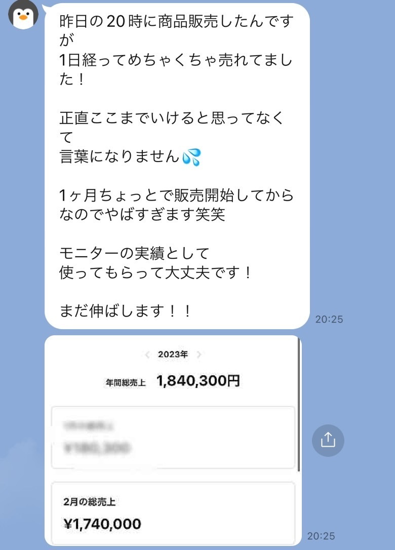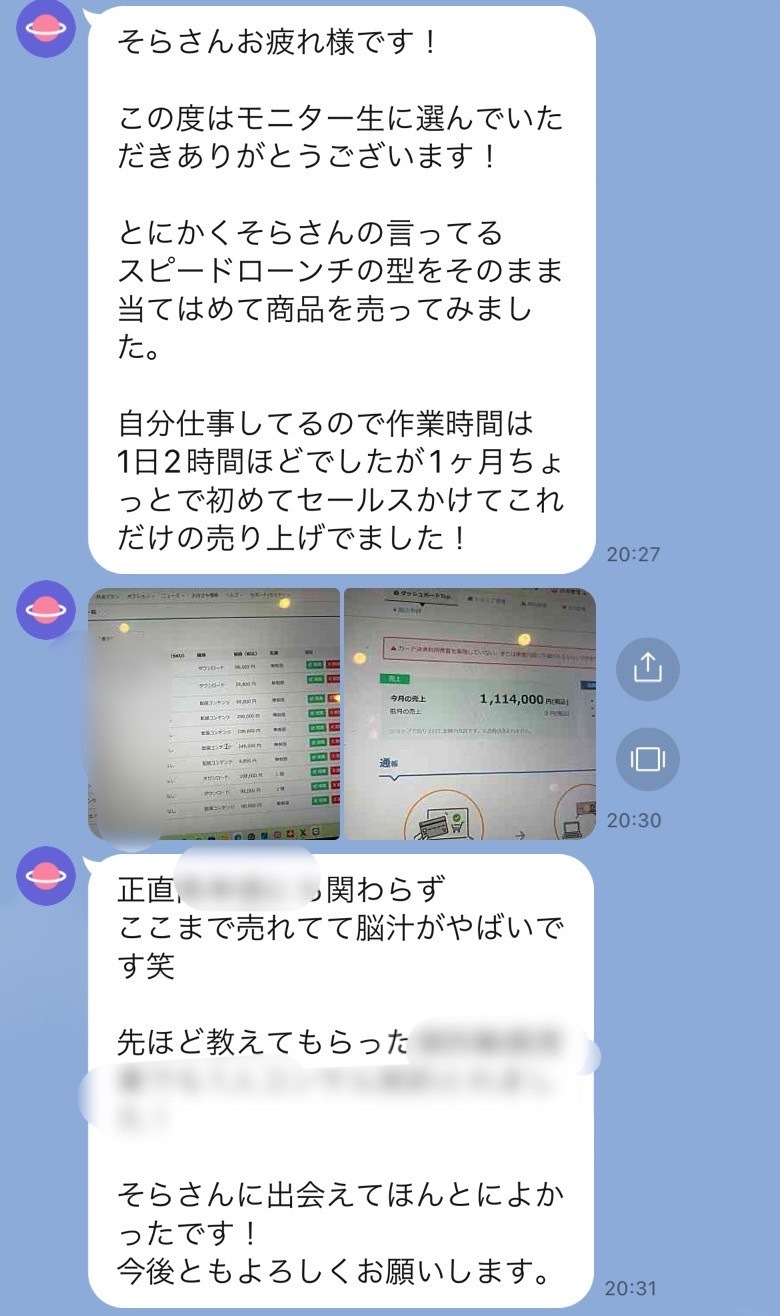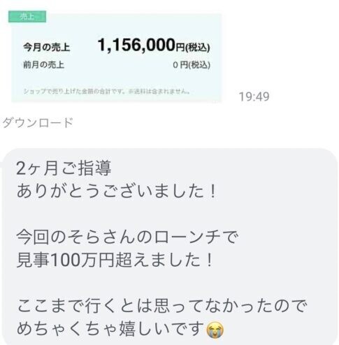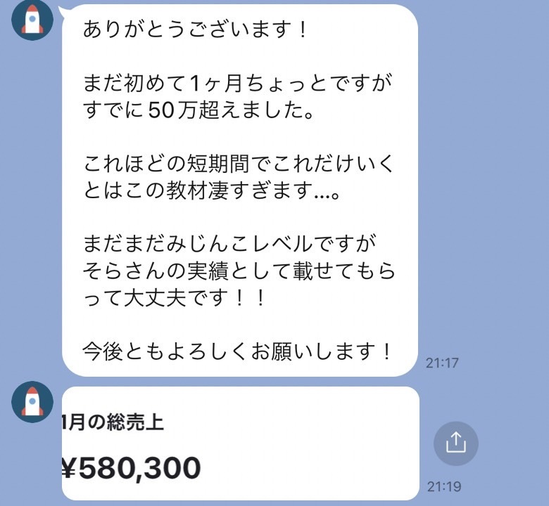 今回教えるコンテンツ販売は型やロジックがあり 僕が以前教えた方は、 そのような実例もあるので問題ありません。 |